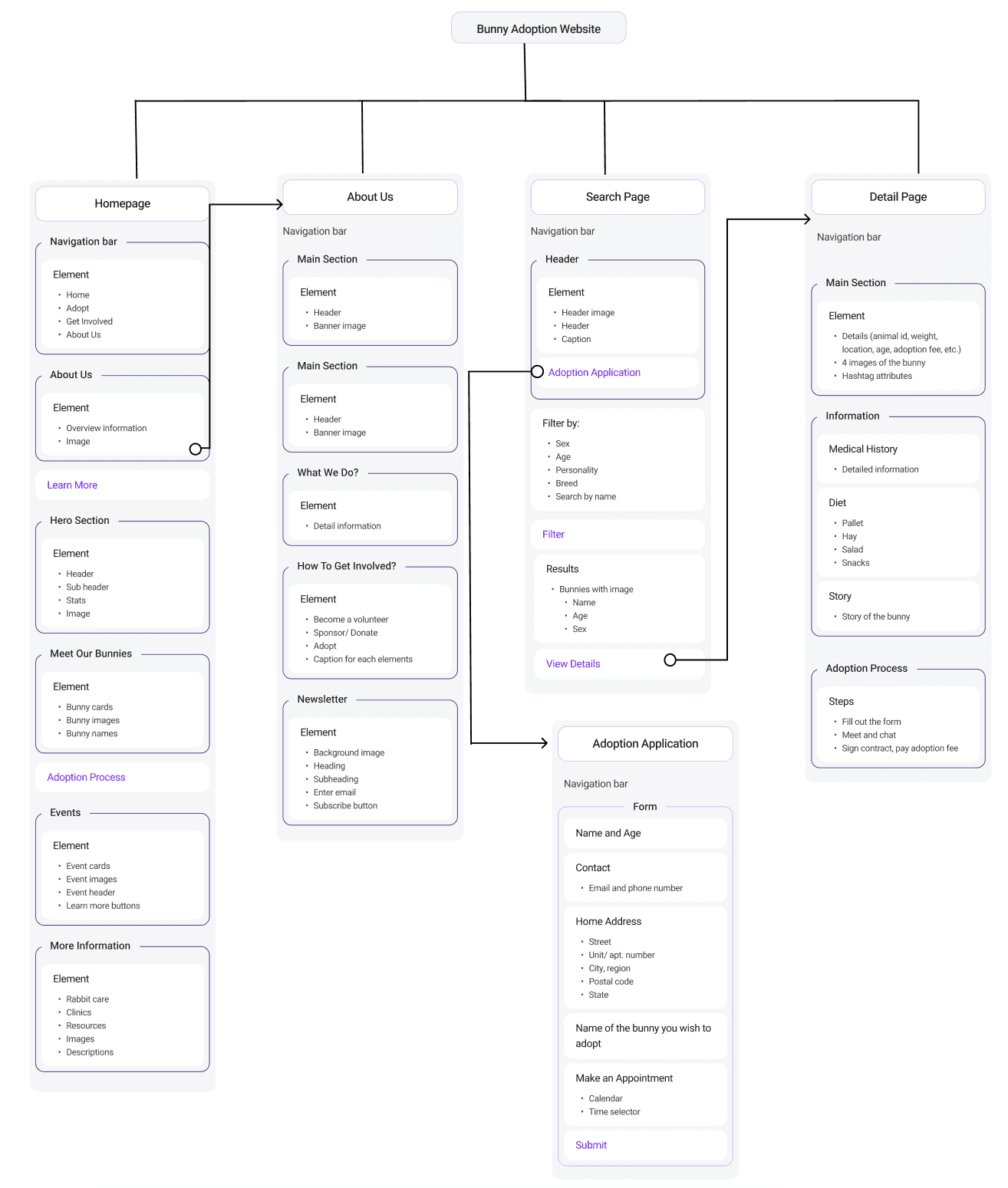 1. Create an intuitive interface that makes it easy for users to browse and filter bunnies by key characteristics such as breed, age, and personality with visual Hierarchy and card layout