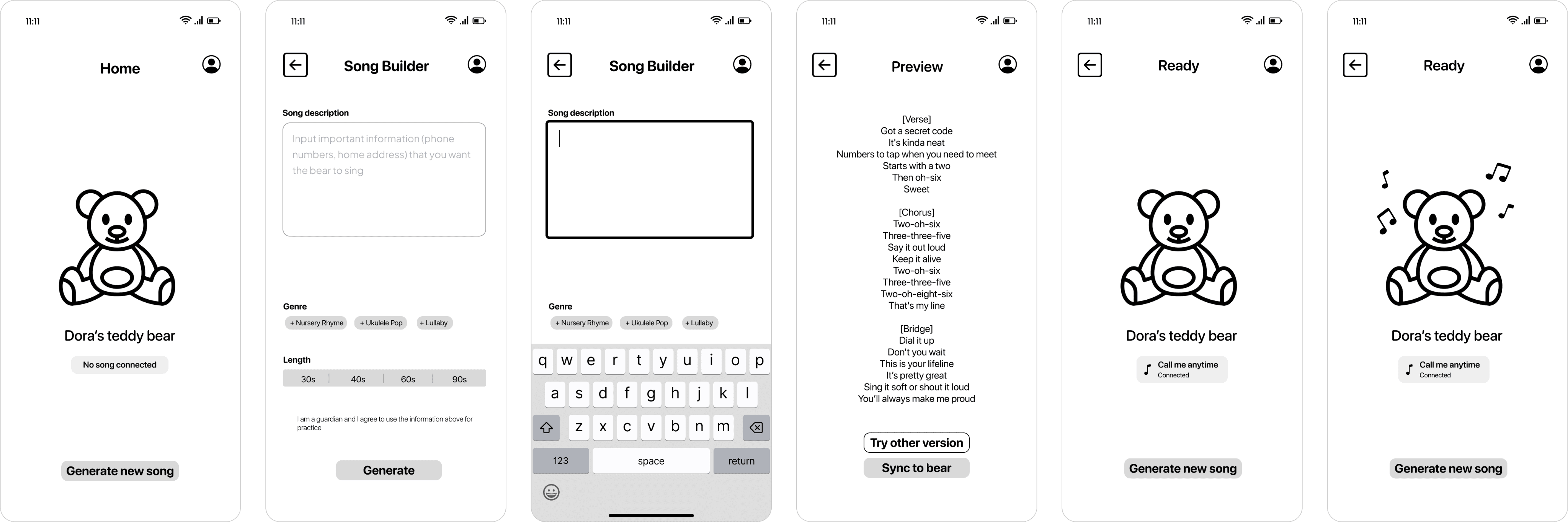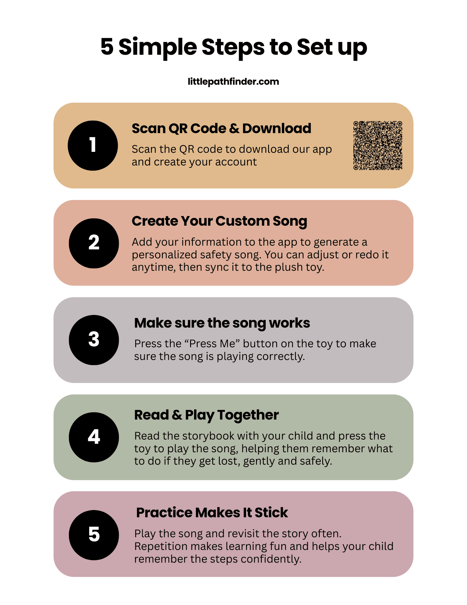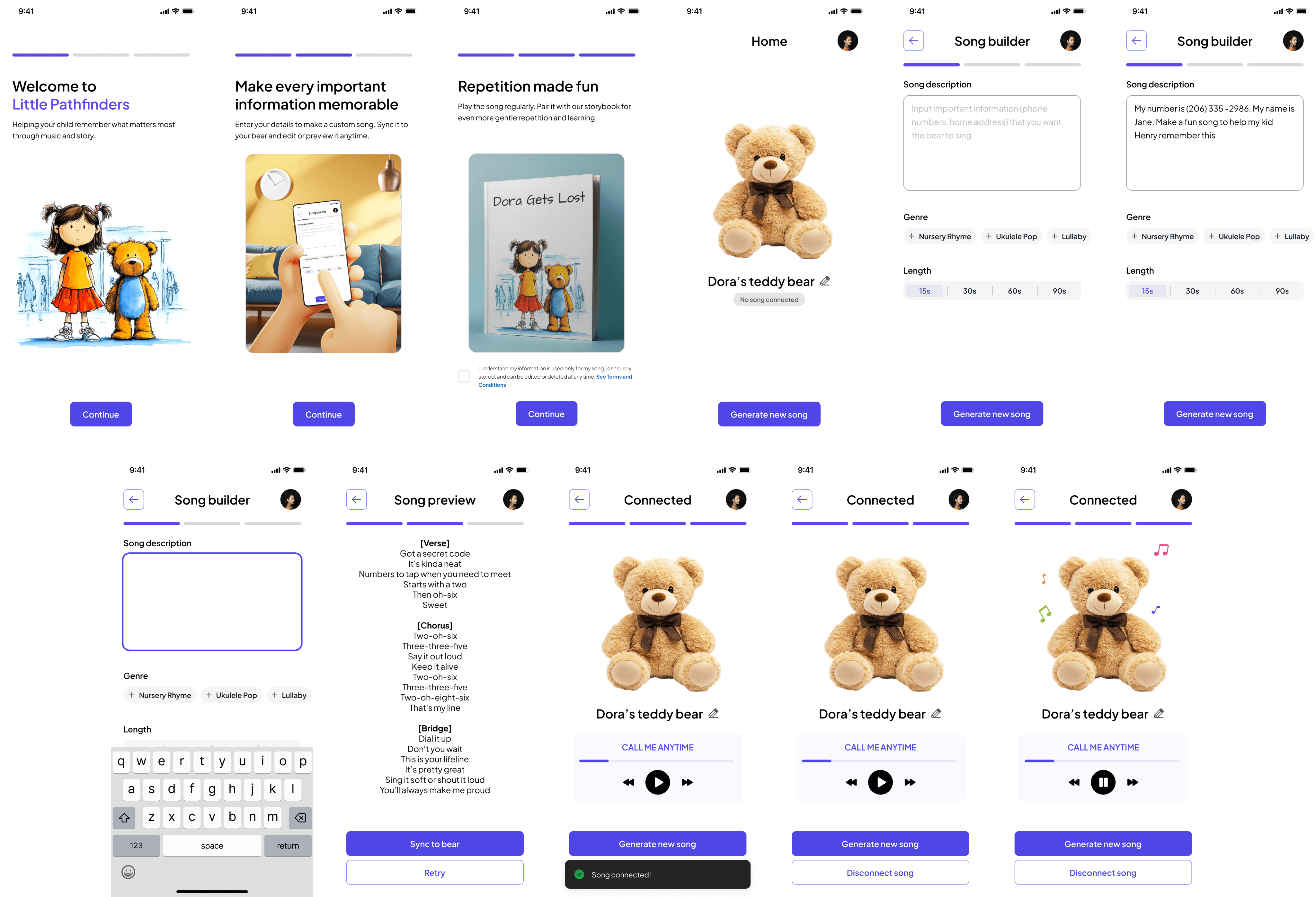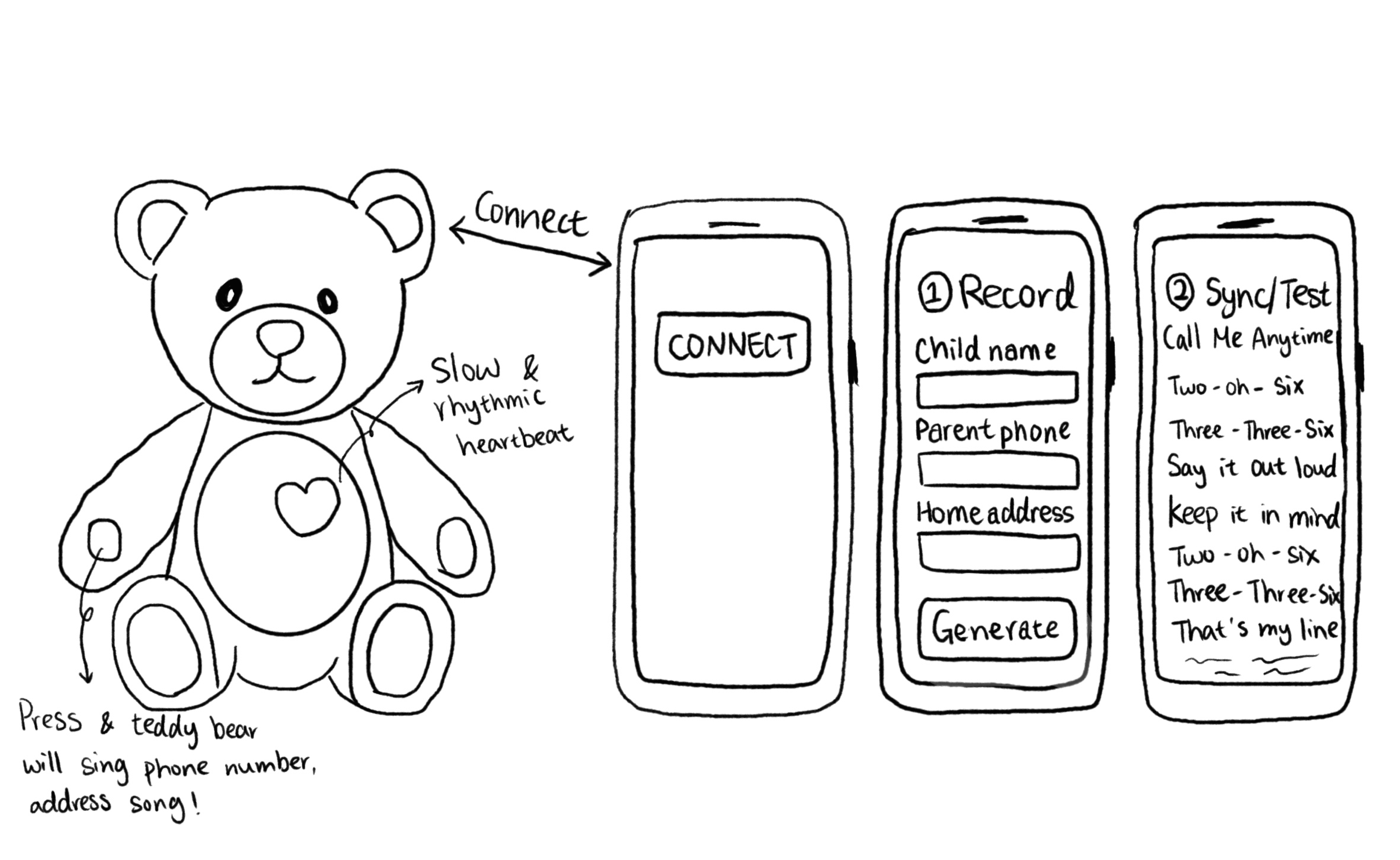 A calming teddy bear that pairs with a parent app to turn contact details into a simple, personalized safety song. The bear’s rhythmic heartbeat and playful singing help children self-soothe and remember what to do if they get lost.
